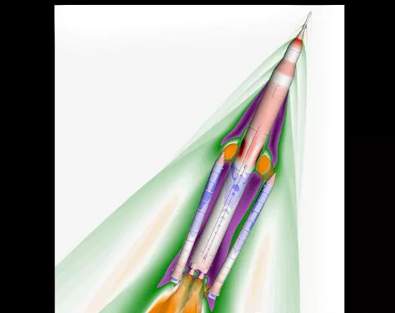 使用NASA的FUN3D代碼模擬SLS Block 1B助推器分離流場(chǎng)。該圖片由Jamie Meeroff,Henry Lee,NASA/Ames提供。