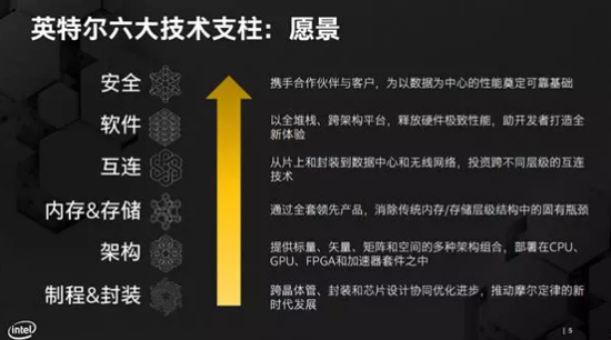 去年底,Intel首次提出了全新的六大技術支柱,全方位構建未來愿景,其中制程工藝與封裝被視為最底層也是最核心的一環,可以說是架構、內存與存儲、互連、軟件、安全其他五大支柱的基石。