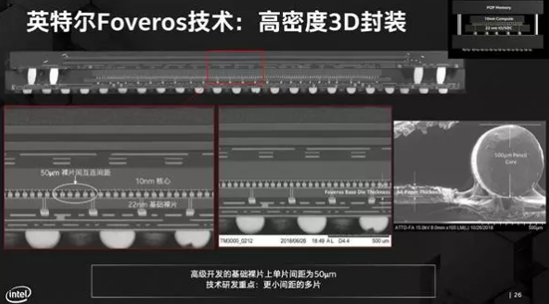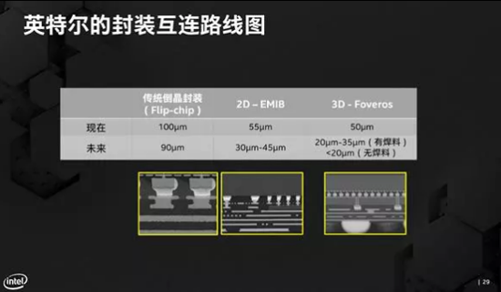 由于采用3D堆疊,Foveros的封裝密度、集成度都更高。2D EMIB封裝裸片間距可以做到55微米,未來也只能縮微到30-45微米,3D Foveros現在就能實現50微米間距,未來還可進一步降至20-35微米(有焊料),甚至是20微米以下(無焊料)。