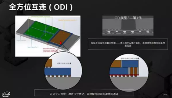 “方向性”一詞恰如其分地概括了ODI的精髓,靈活支持水平、垂直兩種互連、通信方式,更加立體化,同時裸片間的間距和通道依然極短。頂部的裸片可以利用EMIB互連技術與同一平面上的其他裸片進行水平方向上的通信,也可以類似Foveros的方式通過硅通孔(TSV)技術與其下的裸片進行垂直方向上的通信,從而實現全方位的互連通信。此外,ODI封裝中的互連通孔更大,所以帶寬高于傳統TSV,電阻和延遲則更低,整體性能更優秀,電流也可以直接從封裝基底供給到各個裸片,實現更穩定的供電。